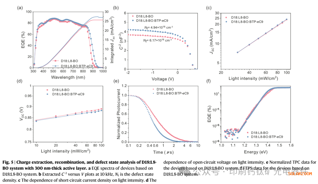 3.BTP-eC9的引入优化了活性层形貌,增大受体畴尺寸,促进载流子长程传输,并有效抑制缺陷态与载流子复合。