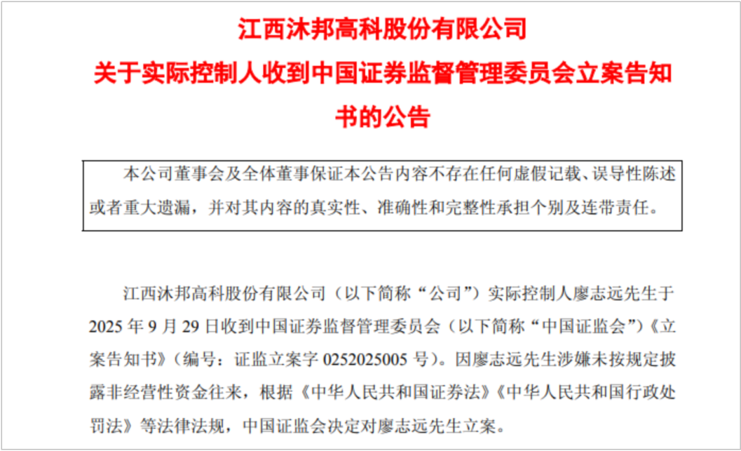 最终,这些问题都被监管部门揪了出来。8月6日,上交所对沐邦高科,控股股东江西沐邦新能源控股有限公司,实控人廖志远,关联方江西豪安能源科技有限公司、张忠安,时任财务总监汤晓春,时任董事会秘书刘毅予以了公开谴责。9月29日晚,证监会对廖志远立案调查。