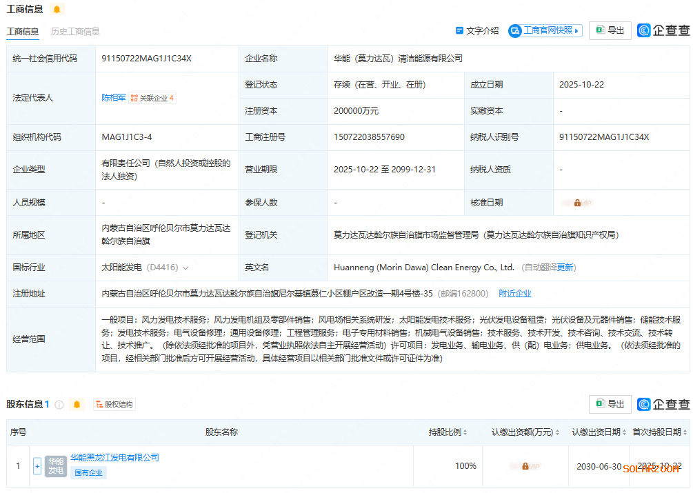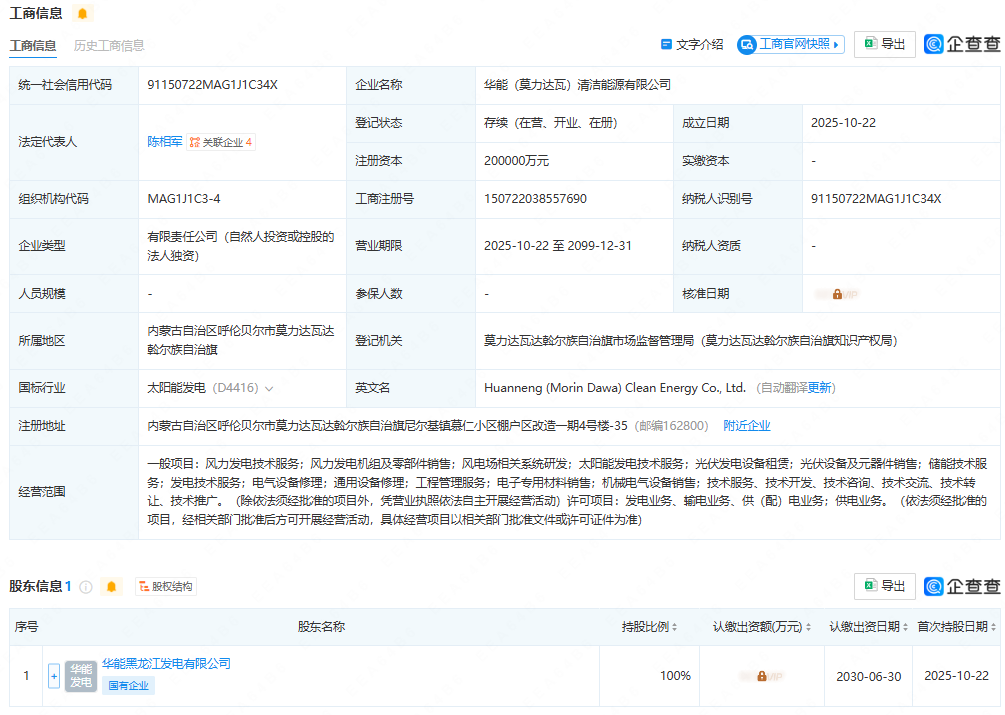 企查查显示,近日,华能(莫力达瓦)清洁能源有限公司成立,法定代表人为陈相军,注册资本为20亿元。