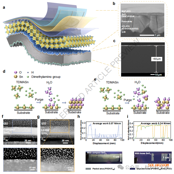 疏松SnOₓ层(吹扫2秒):呈现多孔结构,可有效吸收溅射与弯折过程中的应力,防止界面剥离。 双层协同作用,既保护底层钙钛矿与C₆₀层,又维持高效电子传输路径。