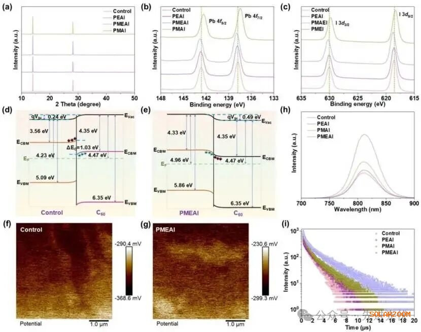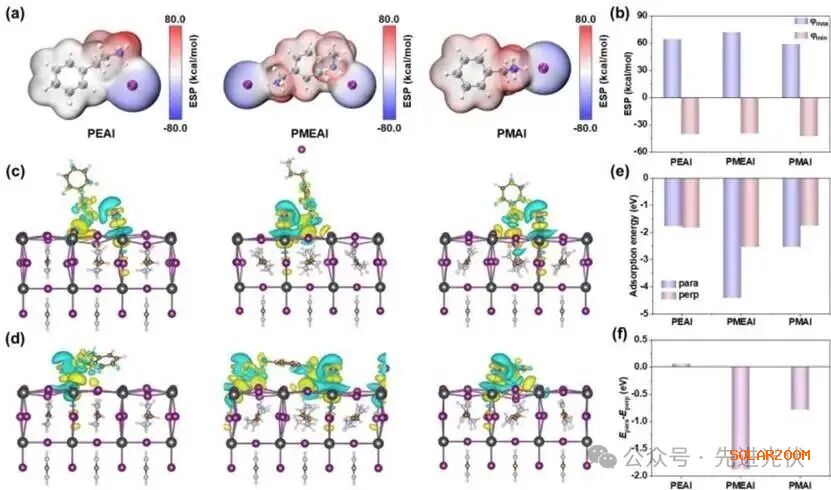 2)实现了低位阻缺陷钝化与高效电荷传输的协同。PMEAI的水平平行排列在实现双位点有效钝化铅、碘空位缺陷的同时,最大限度地减少了传统钝化层因垂直排列产生的空间位阻,解决了提升开路电压与牺牲填充因子和短路电流密度之间的矛盾。