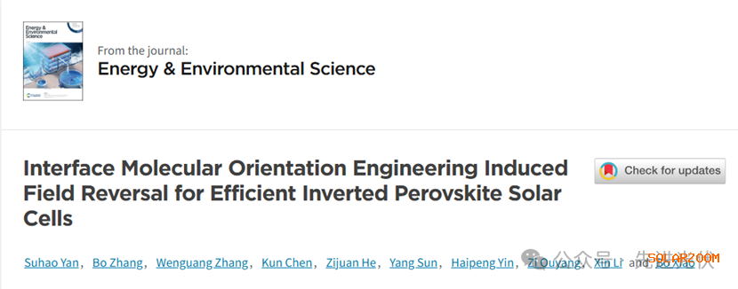 本文针对倒置钙钛矿太阳能电池中钙钛矿与C60界面存在的严重非辐射复合和载流子传输效率低下的问题,设计并合成了一种多功能有机铵盐分子PMEAI作为界面层。该分子的创新之处在于其独特的平行于钙钛矿表面的水平排列方式,这种取向不仅能够同时钝化相邻的铅和碘空位缺陷,更重要的是诱导了界面内建电场的反转,使其方向从C60指向钙钛矿。此举极大地促进了电子提取并抑制了界面复合。同时,水平取向带来的极低分子空间位阻保障了载流子的高效传输。基于PMEAI优化的冠军器件实现了26.7%的光电转换效率,认证效率达25.84%。此外,反向电场还能有效抑制银电极离子的迁移,使器件在ISOS-L-2和ISOS-D-1测试标准下展现出卓越的操作稳定性。