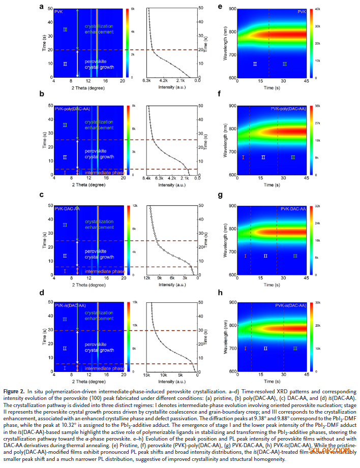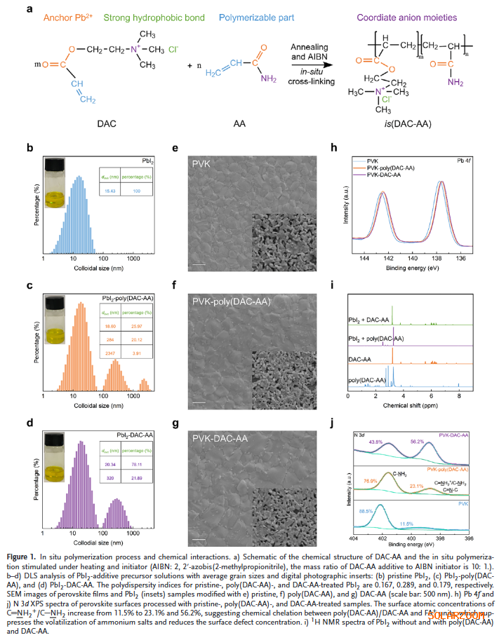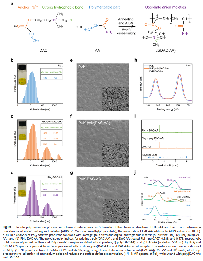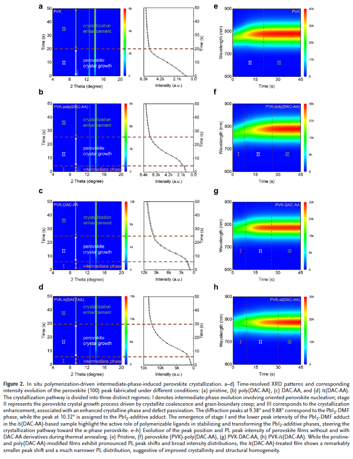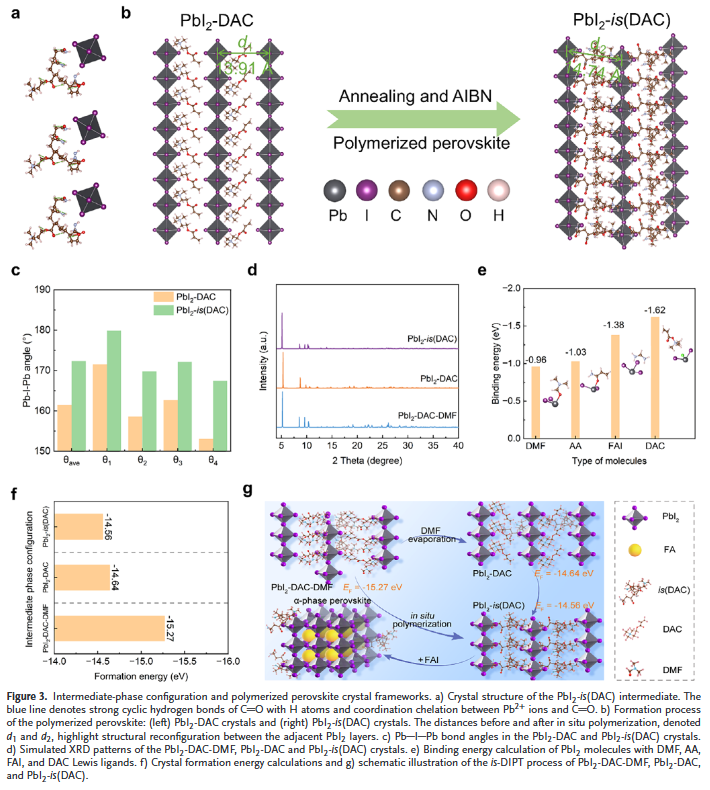 提出原位聚合驱动的动态中间相转变策略,通过可聚合配体DAC-AA调控PbI₂胶体与结晶路径,显著抑制有害的PbI₂-DMF中间体,促进α相钙钛矿形成。