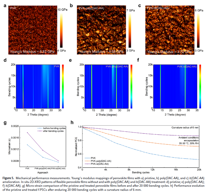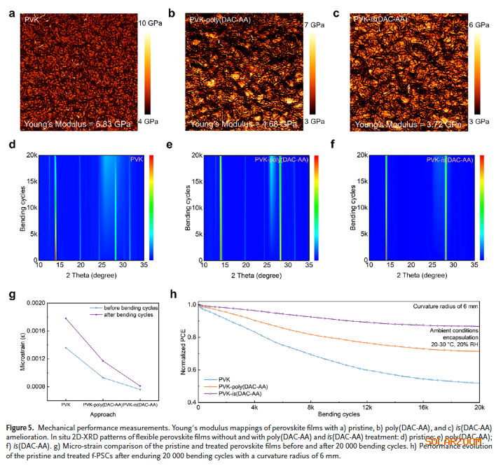 此外,得益于柔性聚合物网络,聚合后的钙钛矿薄膜杨氏模量降低、机械强度提高,在经历2万次弯曲(曲率半径6 mm)后仍保持86.7%的初始效率。