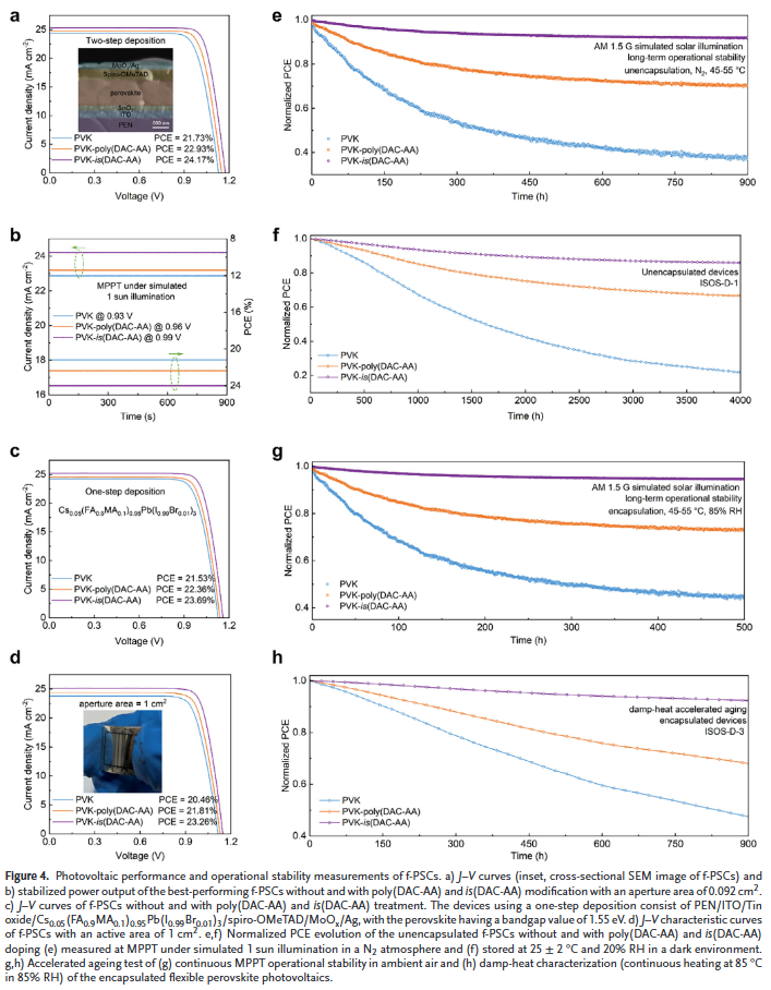 增强机械柔性与稳定性,聚合物网络有效降低薄膜杨氏模量,器件在2万次弯曲后仍保持86.7%的初始效率,具备优异的耐用性。
