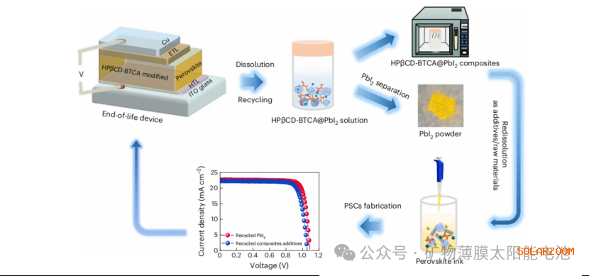 尝试从报废设备中回收含铅复合材料以制造新型活体钙钛矿太阳能电池(图5)。由于HPβCD-BTCA复合物具有出色的铅捕获能力,从失效设备中回收了以碘化铅为主要成分的HPβCD-BTCA@碘化铅复合材料,这些材料可作为添加剂轻松重新溶解用于设备制造。