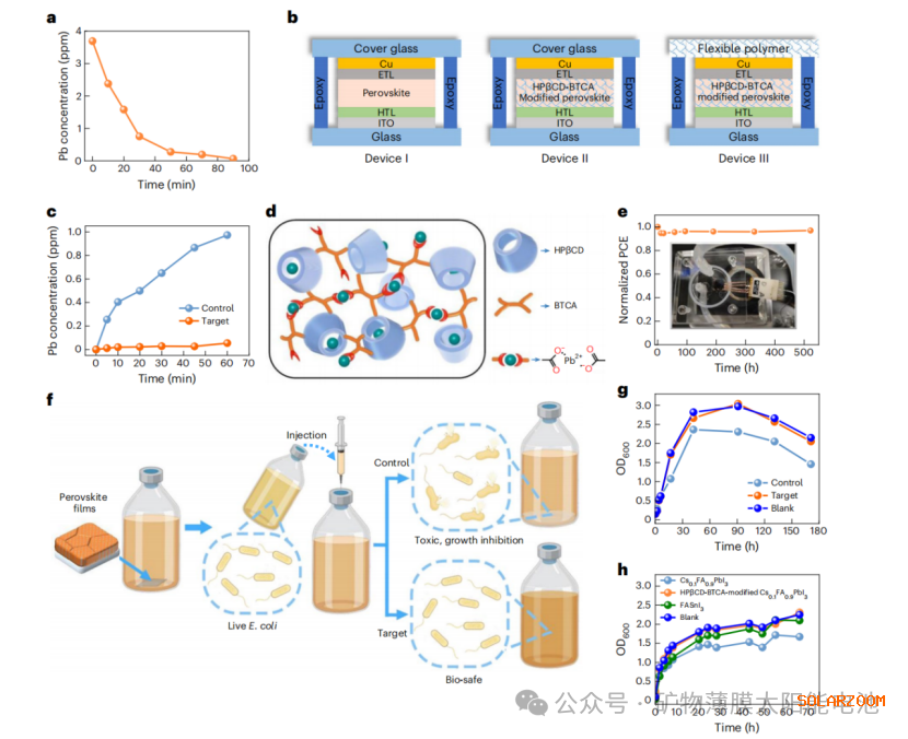 铅泄漏控制(图 4a-c、e):溶液吸附实验:HPβCD-BTCA 可将4 ppm Pb²⁺溶液降至67 ppb(90 分钟);破损器件测试:仅内置复合物的器件(Device II)铅泄漏率从对照组973 mg m⁻²h⁻¹ 降至54 mg m⁻²h⁻¹;叠加柔性封装层的器件(Device III)进一步降至14 mg m⁻²h⁻¹,522 小时水冲刷后PCE 保持97%(4e);毒性测试(图 4f-h):E.coli生长实验(OD₆₀₀监测)显示,改性含铅钙钛矿组与空白组(无铅)的E. coli 生长速率无差异,对照组生长显著受抑;对比实验证明,改性含铅钙钛矿与无铅锡基钙钛矿(FASnI₃)对E. coli 毒性相当,验证铅毒性降低。