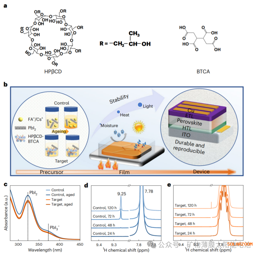 HPβCD和BTCA分子的化学结构如图1a所示。HPβCD和BTCA二元添加剂被直接引入到铯甲酰胺铅碘化物钙钛矿前驱体中。UV-Vis 显示,含HPβCD-BTCA 的前驱体60℃加热48 小时吸收无变化,对照组出现PbI₂特征峰(300-400 nm);¹H NMR 证明,对照组48 小时出现s - 三嗪特征峰(9.25 ppm),而改性组120 小时无s - 三嗪,证明FAI 降解被完全抑制(图1c-e)