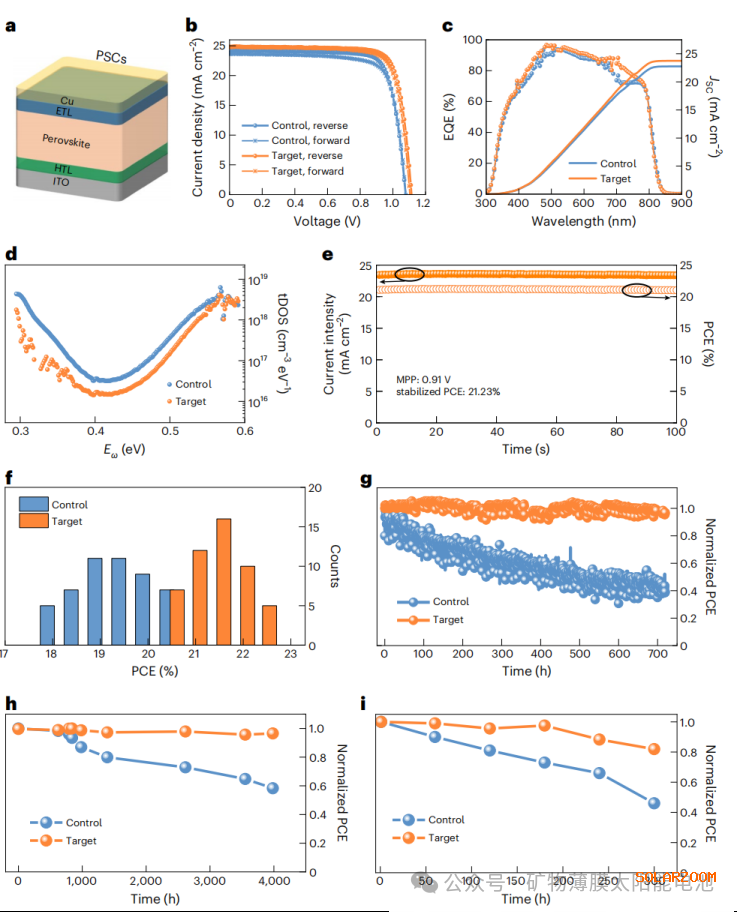 改性器件 J-V 曲线显示冠军PCE 22.14%(VOC 1.12 V,JSC 24.83 mA cm⁻²,FF 79.6%),对照组19.63%;EQE 积分电流与JSC 吻合,证明性能可靠;50个器件统计显示,86% 改性器件PCE>20.5%,仅52% 对照组> 19%,reproducibility 显著提升;热导纳谱(TAS)显示,改性器件全陷阱深度区间的陷阱态密度(tDOS)显著降低(图3d),减少非辐射复合;