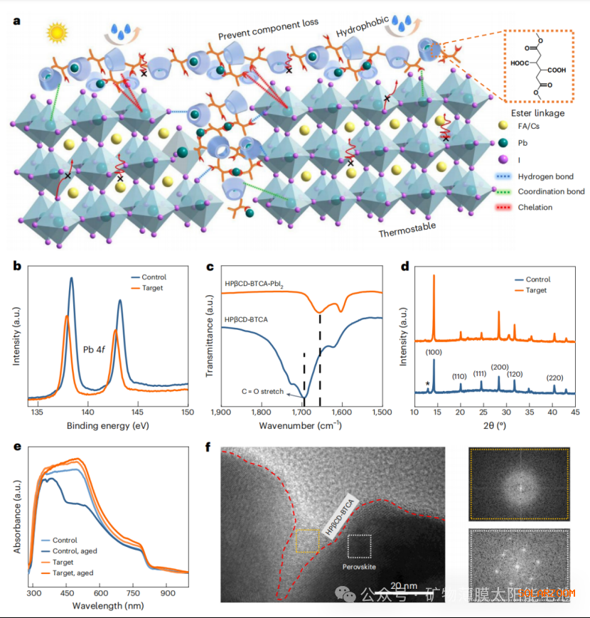 图2钙钛矿与HPβCD-BTCA之间的化学相互作用及其在调节钙钛矿结晶中的有益作用。a,交联HPβCD-BTCA超分子复合物与钙钛矿之间化学相互作用的示意图,以及在提高防水性和热稳定性、防止组分损失和抑制离子迁移方面的优势。b,含或不含HPβCD-BTCA修饰的钙钛矿薄膜的Pb 4f XPS谱图。c,HPβCD-BTCA和HPβCD-BTCA-PbI2粉末的FTIR谱图。d,对照组和目标钙钛矿薄膜的XRD图谱。星号表示碘化铅的XRD峰。e,含或不含HPβCD-BTCA修饰的新鲜和老化钙钛矿薄膜的光吸收谱图。f,HPβCD-BTCA修饰钙钛矿薄膜的高倍透射电子显微镜(TEM)图像及对应的快速傅里叶变换图谱。黄色矩形区域代表非晶态的HPβCDBTCA基质,白色矩形区域代表结晶态的钙钛矿。
