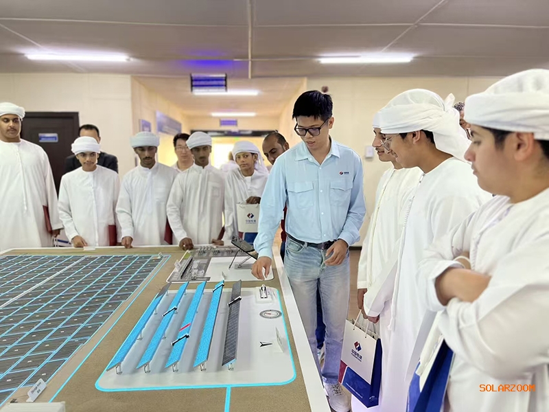 本次实践活动以“知识讲解+互动体验+实地探访”三位一体模式展开,内容丰富且层层递进。在光伏知识讲解环节,PV3项目专业团队通过趣味视频、真实案例与通俗语言,系统解读光伏发电原理、太阳能板工作机制,以及沙漠地区超大型光伏电站建设的技术创新与施工挑战,让专业知识变得通俗易懂。互动问答环节中,学生们围绕“太阳能电站组成部分”“太阳能储存技术”“沙漠光伏防尘方案”等核心问题踊跃提问,现场氛围热烈,项目工程师代表结合自身从业经历,分享可再生能源领域的成长故事,进一步点燃学生们的科学探索热情。体验环节中,师生们首先参观光伏沙盘体验区,项目团队借助立体模型,生动演示电站整体布局、施工流程与智能化运维体系,直观展现中国电建在清洁能源领域的技术实力与管理水平;随后,师生们乘车进入项目现场,近距离观察光伏组件的实际应用场景,感受“蓝色光伏海洋”在沙漠中绽放的绿色能量。参与学生纷纷表示,这是他们首次走进大型清洁能源项目,不仅收获了专业知识,更对绿色科技产生了浓厚兴趣,活动极具实践价值。此外,中东北非区域总部阿联酋国别代表洪丽还向师生们介绍了中国电建在全球及阿联酋的重点工程项目,全面展示中国企业在技术创新、基建建设与社会责任方面的综合实力,加深了学生们对中企的认知与认同。