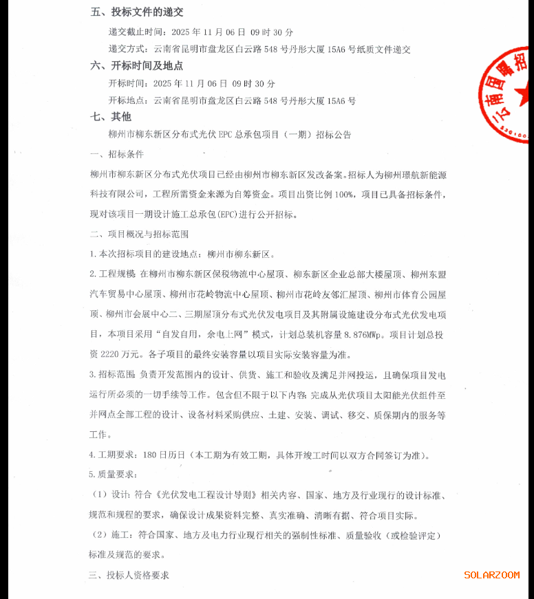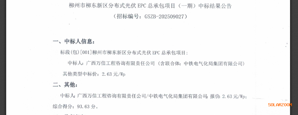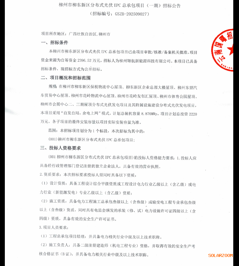 广西柳州:8.876MW分布式光伏EPC中标结果公示,中标价2.63元/W_SOLARZOOM光储亿家