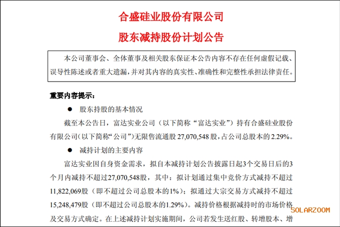 昨日(11月11日)浙江700亿光伏巨头合盛硅业发布公告称,“其控股股东富达实业因自身资金需求,拟自本减持计划公告披露日起3个交易日后的3个月内减持不超过27.070.548股,其中:拟计划通过集中竞价方式减持不超过11.822.069股(即不超过公司总股本的1%);拟通过大宗交易方式减持不超过15.248.479股(即不超过公司总股本的1.29%)。”