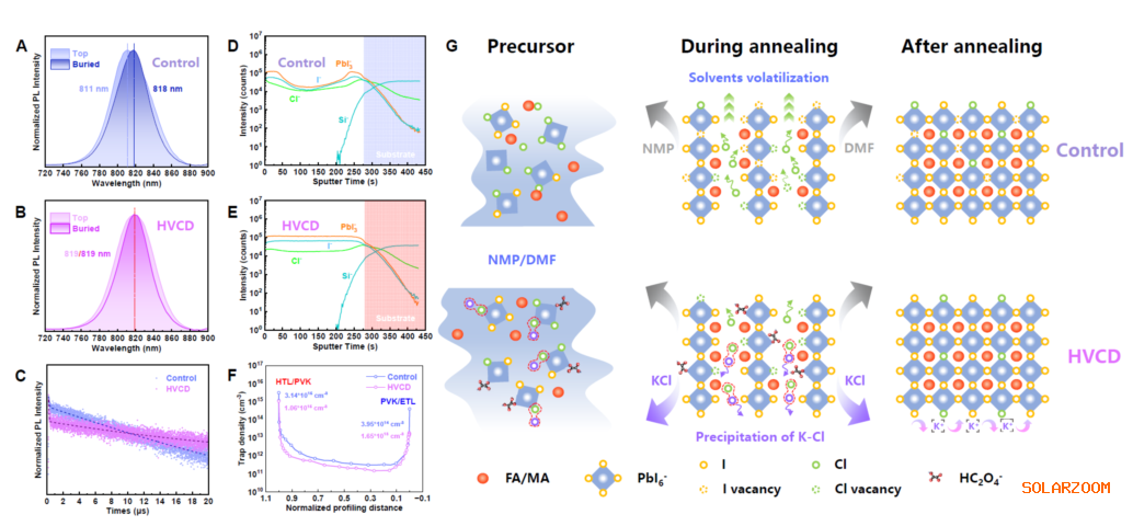 科研团队通过在钙钛矿薄膜生长中引入碱金属草酸盐,利用解离出的钾离子与氯离子之间的强结合作用,有效束缚氯元素的垂直无序迁移,使其在钙钛矿材料中均匀分布。基于这一方法,研究团队成功制备出载流子寿命高达20微秒,界面缺陷态密度低至1013每立方厘米的钙钛矿半导体薄膜。