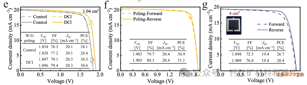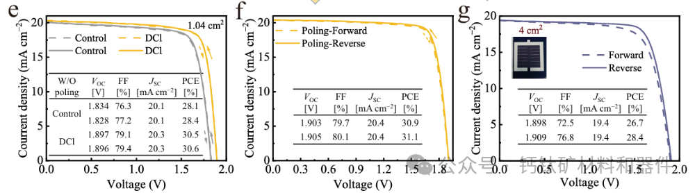 重要的是,自发极化的DCl阳离子诱导具有面内取向和明显铁电性的相纯准二维钙钛矿的生长。这种铁电效应通过上移表面功函数和促进有利的 p-to-n 表面能量跃迁来促进载流子的分离和提取。结果是形成了铁电准二维钙钛矿层,增强了电荷传输并抑制了整个界面的复合。