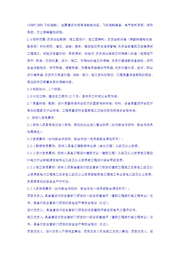 招标范围:负责站址勘察、施工图设计、竣工图编制;负责全部设备(磷酸铁锂电池储能系统)材料采购、催交、运输、接车、接货验收和仓储保管等;负责全部建筑及安装调试工程施工,试验及检查测试,系统调试,试运行;负责送出线路及对端接入改造(包括但不限于:核准、初设批复、设计、施工、对端站改造及协调等;负责办理储能设备抽检、并网安全性能检测、并网手续、调度手续,购售电手续等;涉网手续 负责办理水保、安评、职业评价等手续;负责开工手续办理、消缺、培训、竣工资料的移交、工程质量保修期限的服务周边政府及民事关系协调等内容。