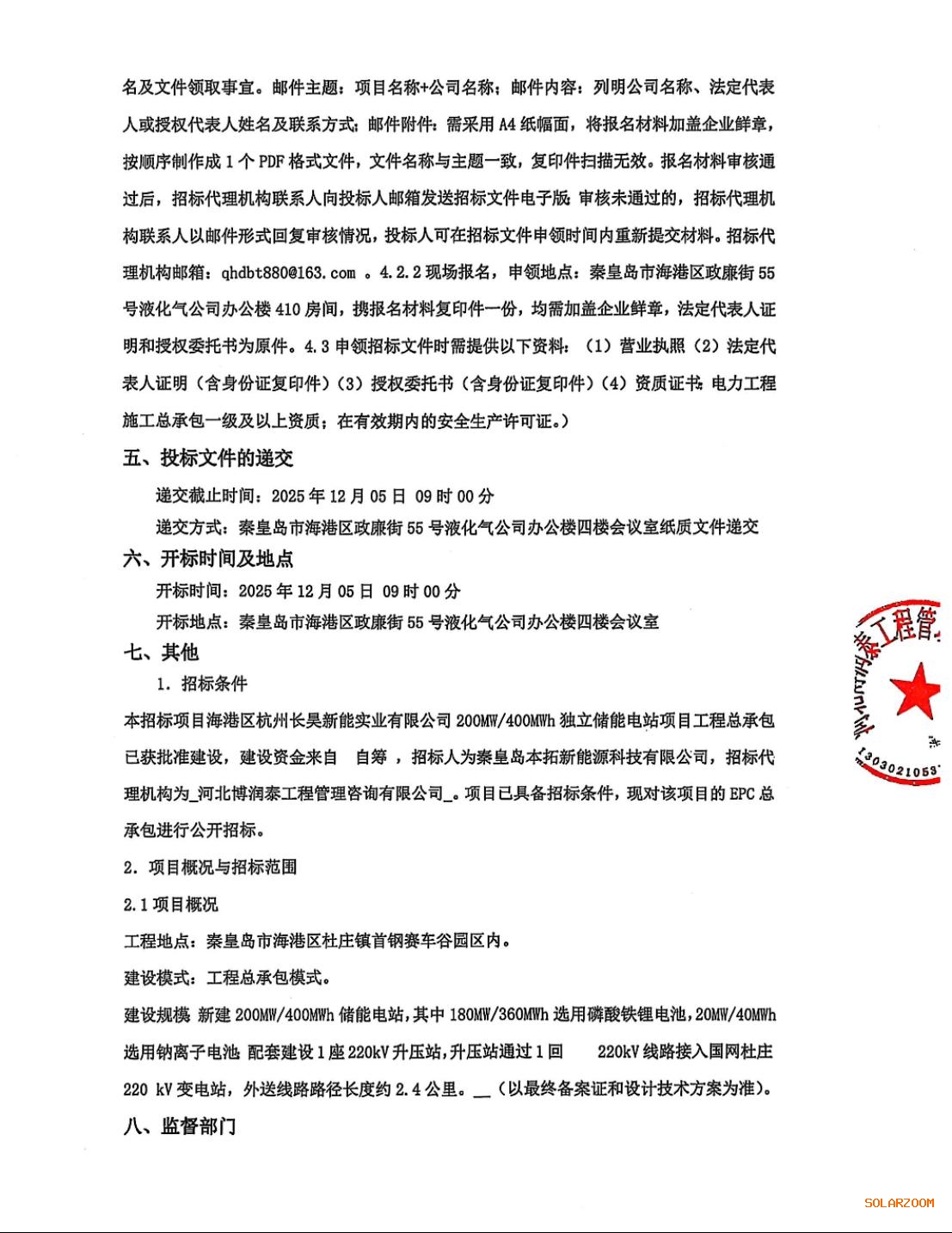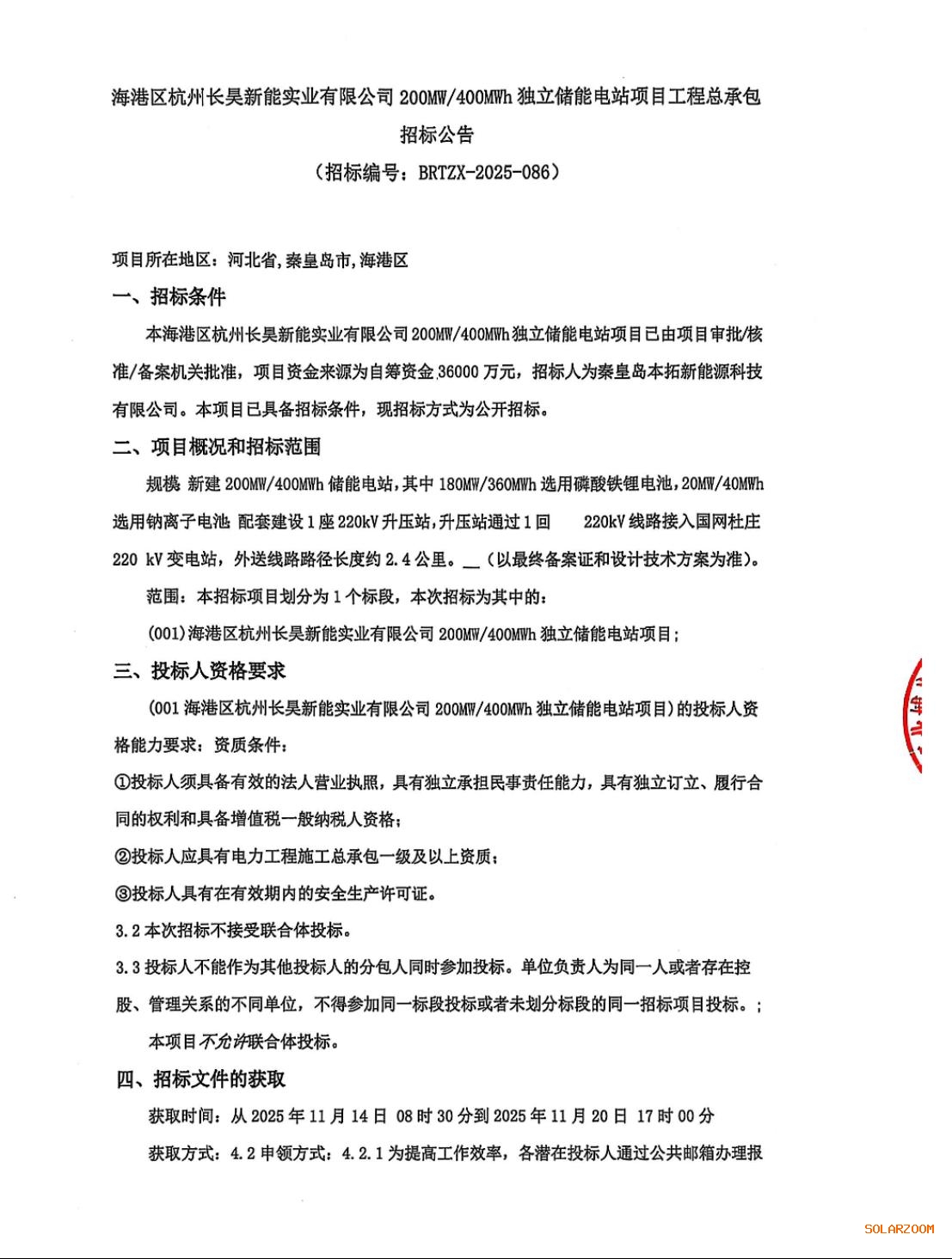 11月13日,海港区杭州长吴新能实业有限公司200MW/400MWh独立储能电站项目工程总承包招标公告发布,项目招标人为秦皇岛本拓新能源科技有限公司。