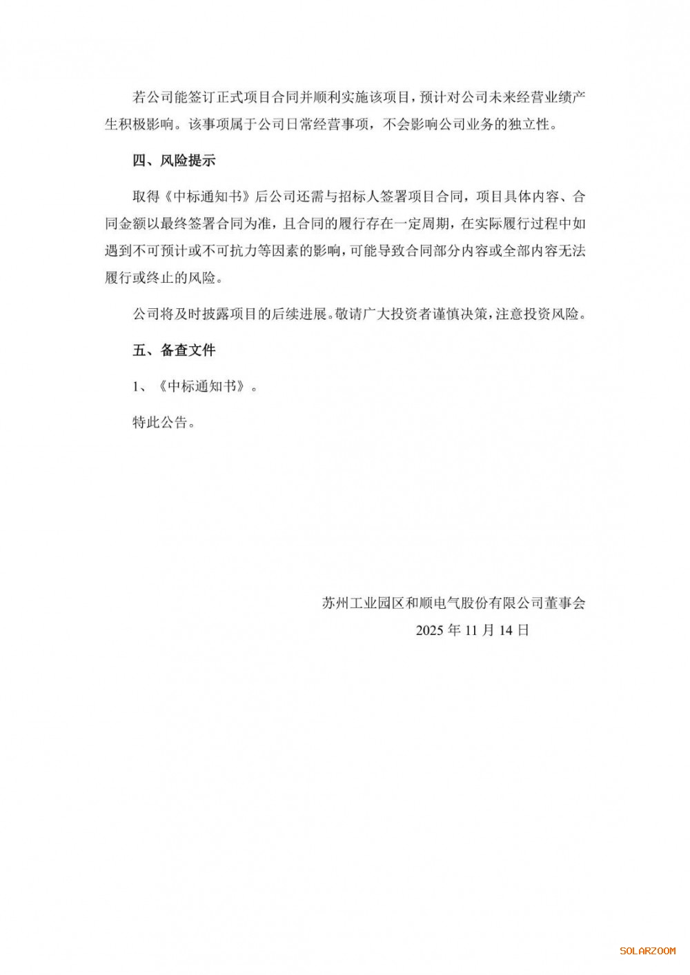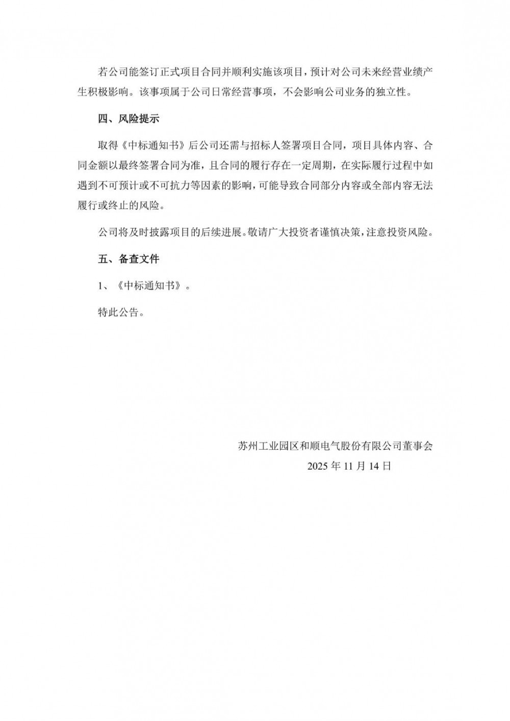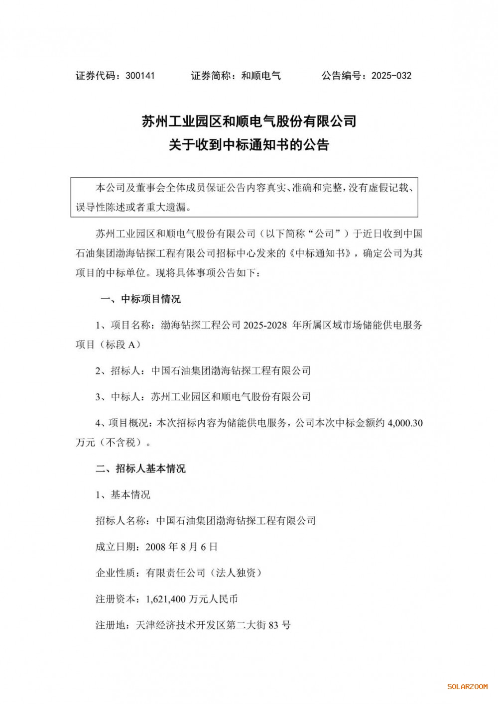 11月13日,和顺电气发布公告称,公司于近日收到中国石油集团渤海钻探工程有限公司招标中心发来的《中标通知书》,确定公司为其项目的中标单位。本次招标内容为储能供电服务,公司本次中标金额约4.000.30万元(不含税)。