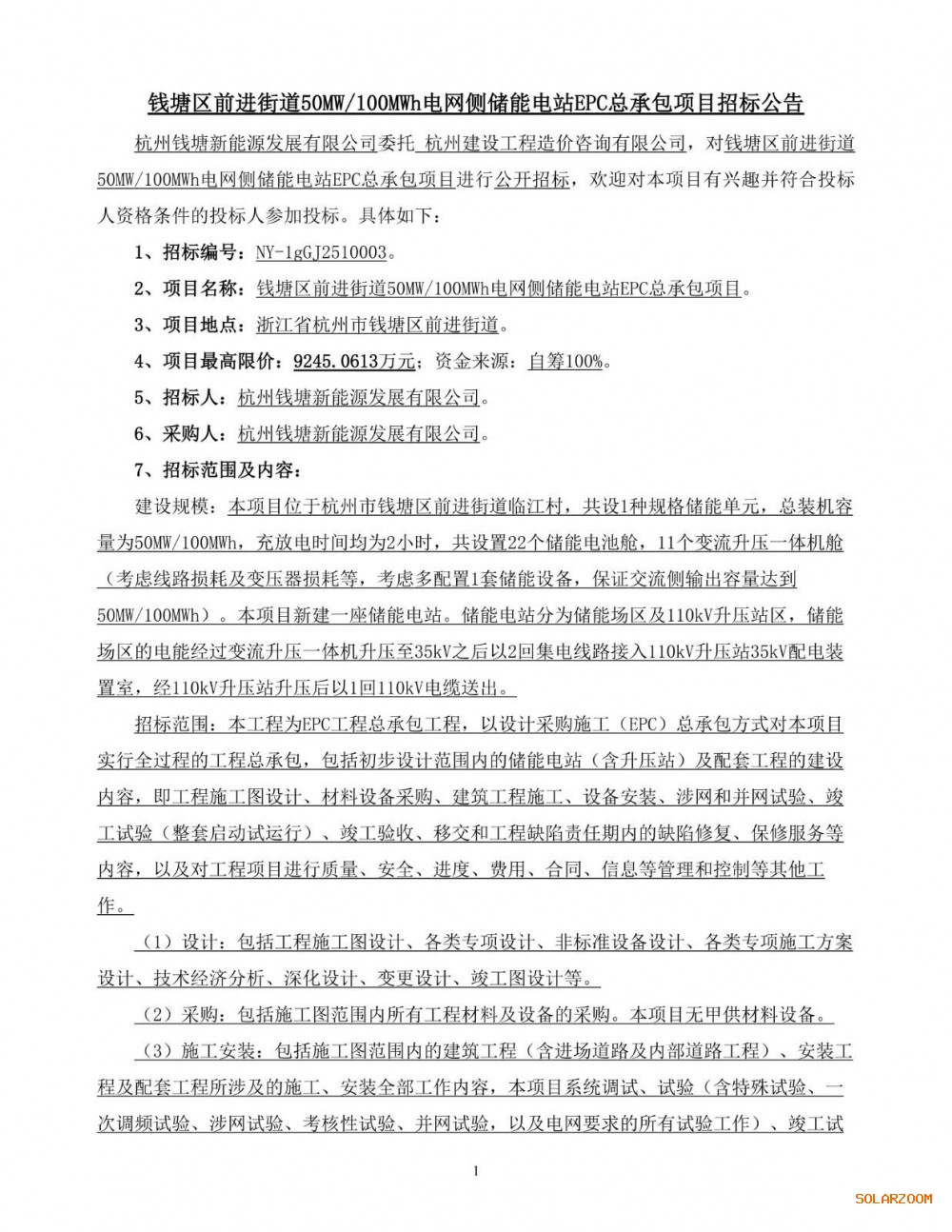 11月13日,钱塘区前进街道50MW/100MWh电网侧储能电站EPC总承包项目招标公告发布。