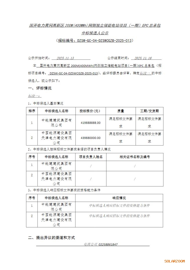 11月13日,国开电力黄冈高新区200MW/400MWh网侧独立储能电站项目(一期)EPC总承包中标候选人公示。