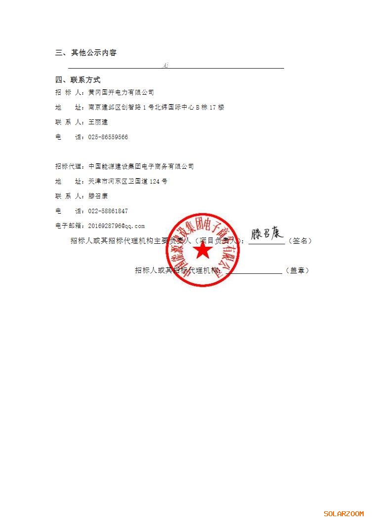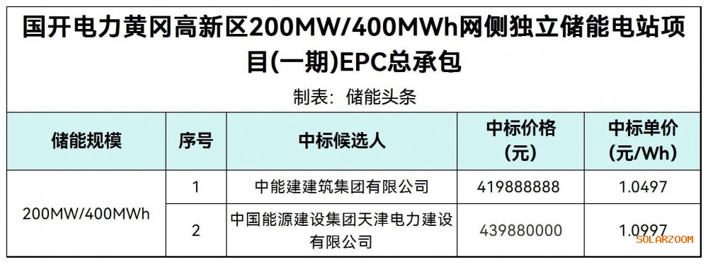 第一中标候选人为中能建建筑集团有限公司,投标报价为41988.89万元,折合单价为1.0497元/Wh;第二中标候选人为中国能源建设集团天津电力建设有限公司,投标报价为43988万元,折合单价为1.0997元/Wh。