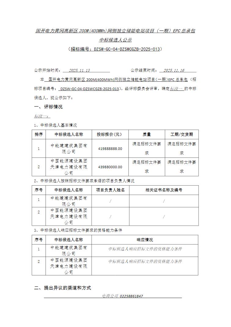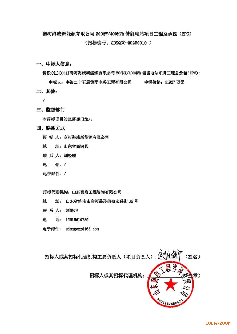 11月13日,商河海威新能源有限公司200MW/400MWh储能电站项目工程总承包(EPC)中标结果发布。