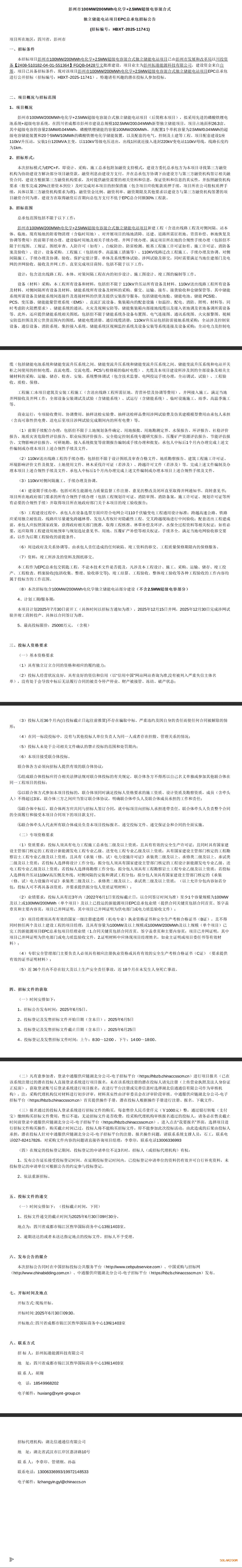 本次招标包含100MW/200MWh电化学独立储能电站部分建设(不含2.5MW超级电容部分)。
