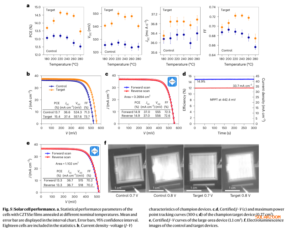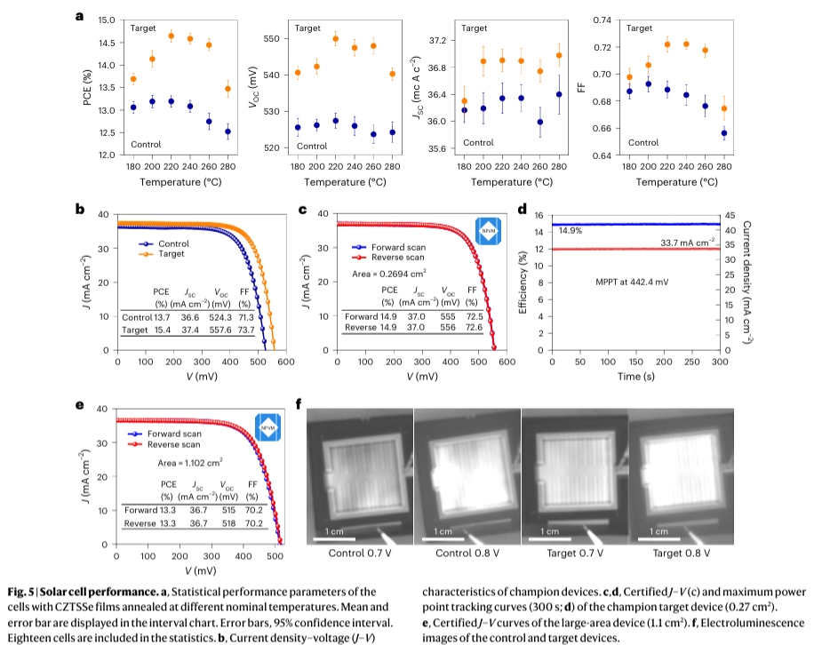 效率突破与大面积器件验证: 该工作获得了14.9%的认证效率,是当前CZTSSe太阳能电池领域的最高效率之一,证明了该策略的有效性。同时,团队成功制备了面积为1.1 cm²的电池,并实现了13.3%的认证效率,展现了该技术走向大面积、产业化的良好潜力。