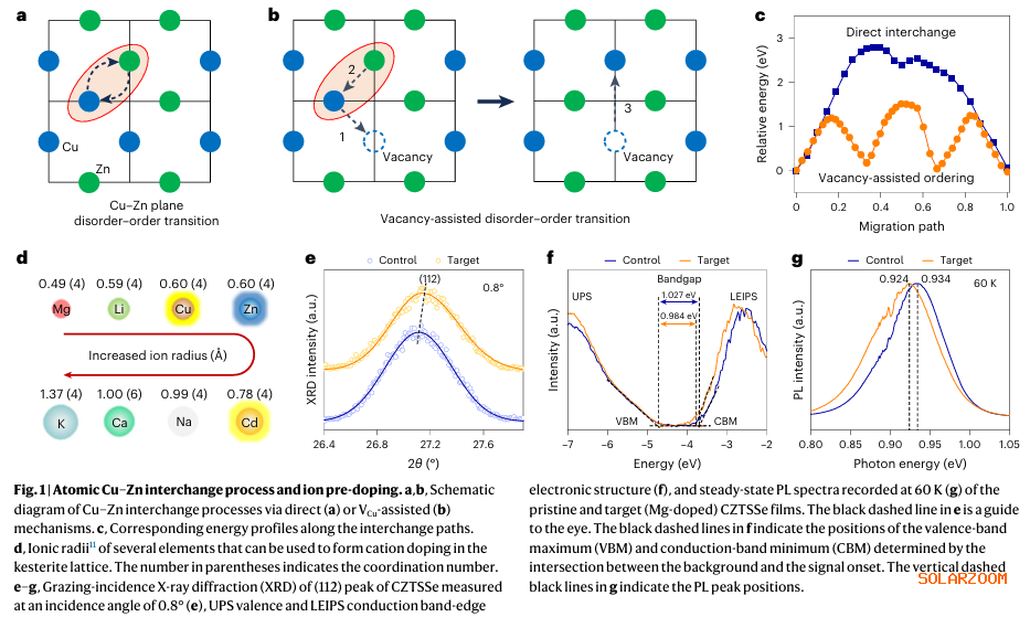 原子无序是多元素晶体材料中普遍存在的难题,并对铜锌锡硫硒(CZTSSe)光伏器件的性能构成了关键挑战。其中,铜-锌(Cu-Zn)无序因其形成能低而尤为常见,会导致高浓度的深能级缺陷和严重的电荷损失。由于无序-有序相变的热力学与原子互换动力学之间存在难以调和的矛盾,调控这种无序态一直非常困难。