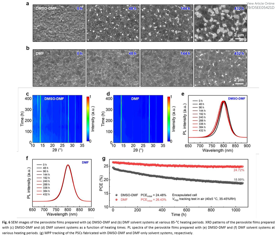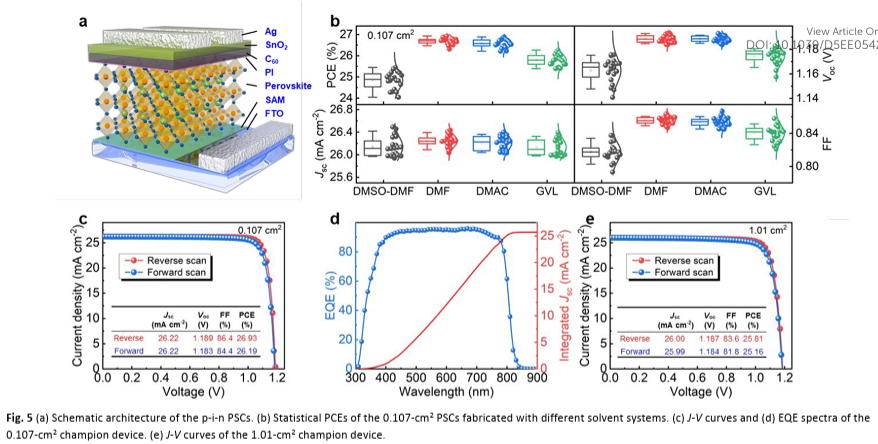 绿色溶剂兼容与高稳定性:该方法成功拓展至环保型溶剂GVL,并获得26.27%的高效率。器件在连续运行1000小时后仍保持94%以上初始性能,相稳定性显著优于传统DMSO体系。