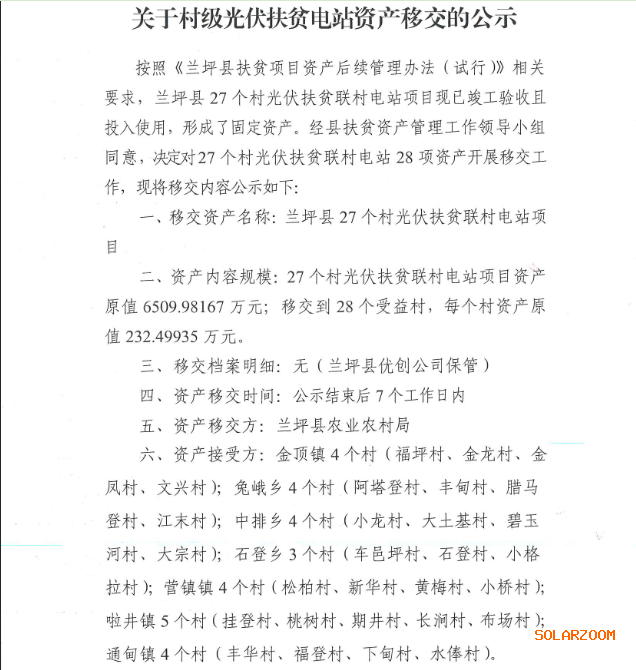 河南兰坪县关于村级光伏扶贫电站资产移交的公示
