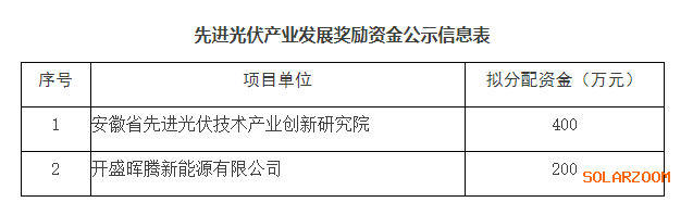 此次公示的获奖企业共2家,具体分配方案如下:安徽省先进光伏技术产业创新研究院拟获400万元资金支持,开盛晖腾新能源有限公司拟分配200万元奖励资金。