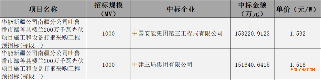 11月25日,中国华能电子商务平台发布华能新疆公司南疆分公司吐鲁番市鄯善县楼兰200万千瓦光伏项目施工和设备打捆采购工程预招标中标结果公示,中标人分别为中国安能集团第三工程局有限公司、中建三局集团有限公司,单价分别为1.532元/W、1.516元/W。