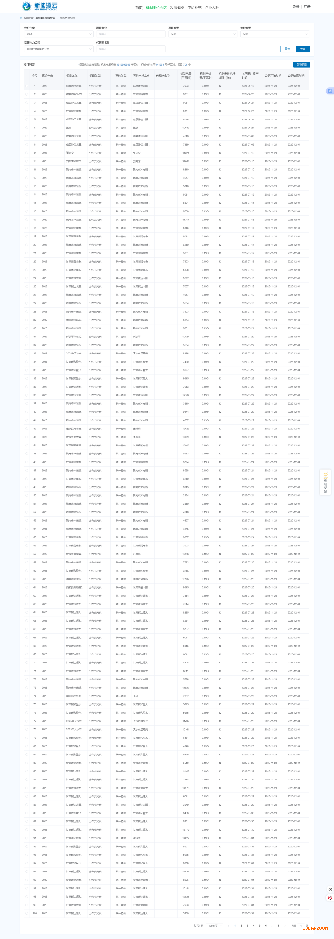 11月28日,国网新能源云公示甘肃省第二轮机制电价竞价结果,即2026年1月1日至2026年12月31日期间已投产和计划投产、且未纳入过机制执行范围的新能源项目。