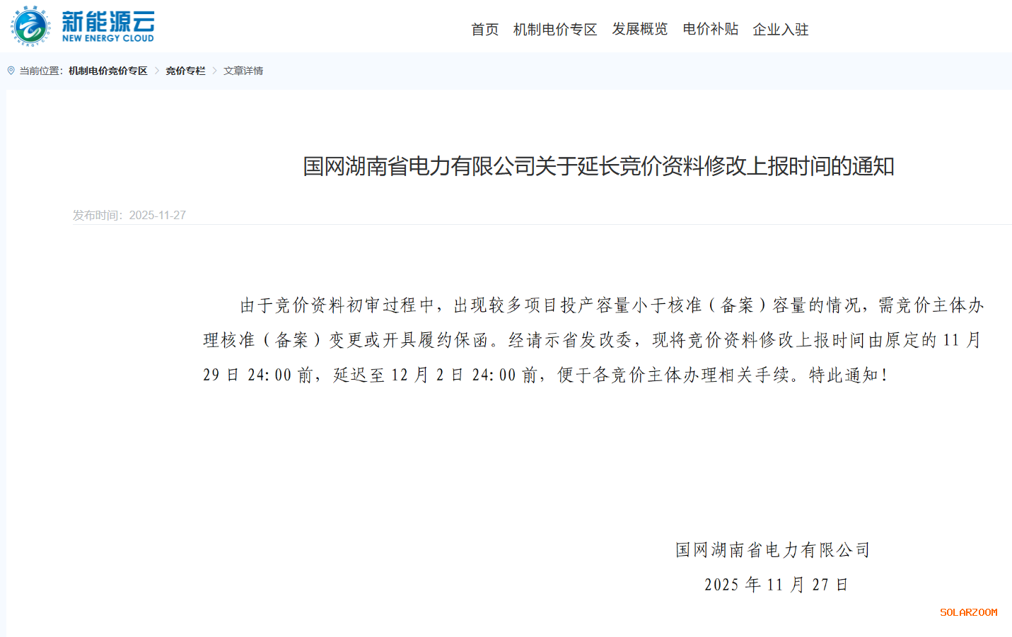 11月27日,新能源云发布国网湖南省电力有限公司关于延长竞价资料修改上报时间的通知,竞价资料修改上报时间由原定的11月29日24:00前,延迟至12月2日24:00前。