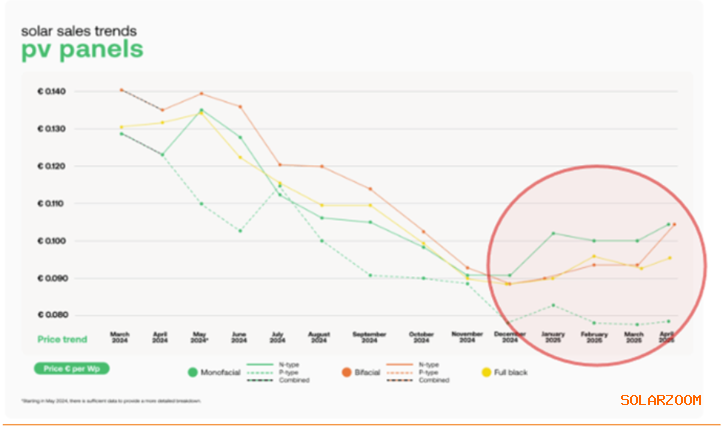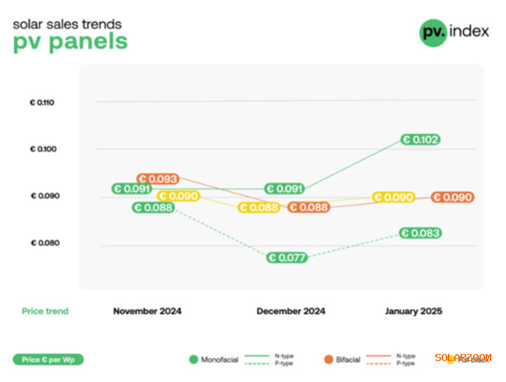 尽管年初几周仍在持续清理库存,但2025年第一季度n型组件价格已出现小幅上调。这一转变部分归因于中国制造商有意限制向欧洲仓库的发货量。多数主要生产商选择在上半年保持当地库存处于最低水平。提前锁定货源的分销商则从市场形势改善中暂时获益。许多分销商精简了产品组合,以避免库存积压。此前仓库的大量过剩库存逐渐转变为更为严控的库存管理,或新交货期延长。