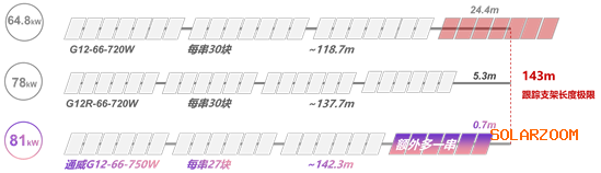 图3:满1500V系统电压设计下的两种组件单根跟踪支架总功率及长度对比