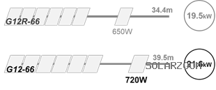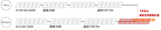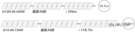 面对该场景,常见的电站设计方式为采用常规的210规格720W组件,或者使用高效的210R规格650W组件。按照常规思路,两款组件均采用30块/串满1500V系统电压设计,此时两串组件的总功率分别为21.6kW和19.5kW,组串长度分别为39.5m和34.4m。