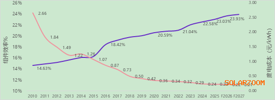 图1:2010年来光伏度电成本及光伏组件转换效率变化
