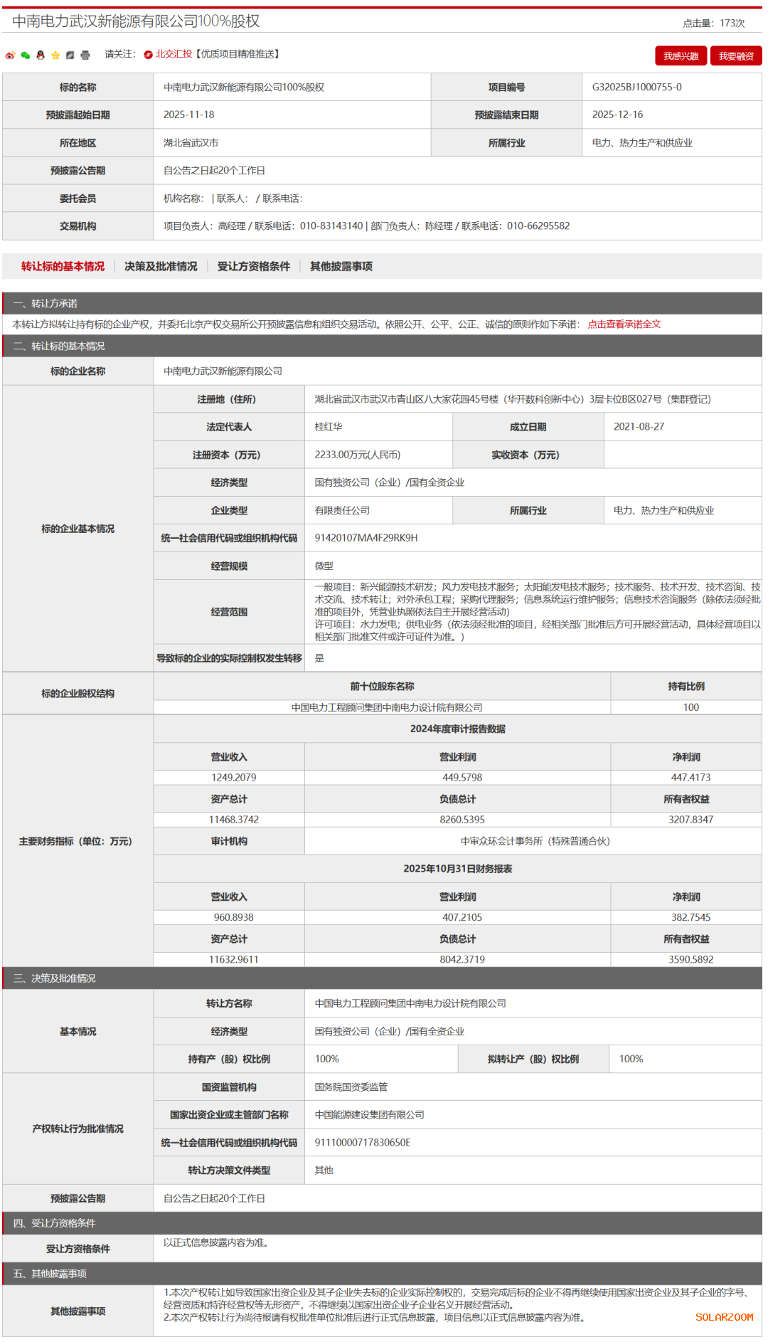 日前,中国电力工程顾问集团中南电力设计院有限公司挂牌转让中南电力武汉新能源有限公司100%股权。
