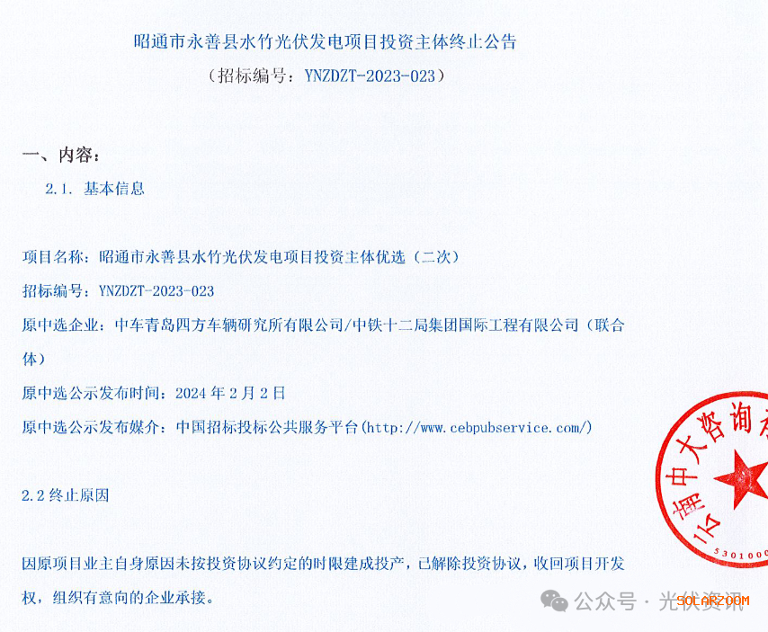 近日记者了解到,近日,云南昭通市永善县水竹光伏发电项目投资主体终止公告发布。