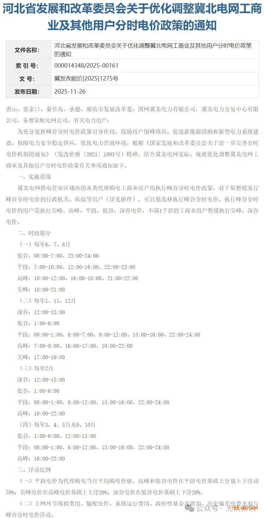 近日记者了解到,11月26日,河北省发展和改革委员会印发关于优化调整冀北电网工商业及其他用户分时电价政策的通知。