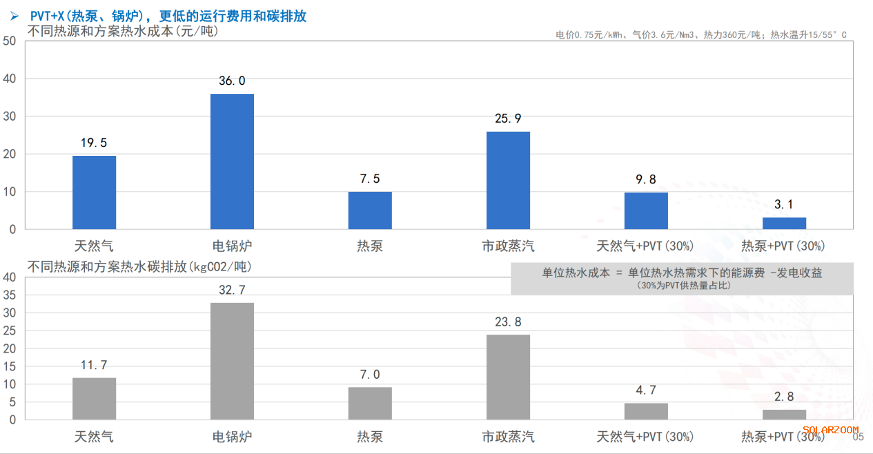 而在不同热源和方案热水成本的对比中,按照电价0.75元/kWh、气价3.6元/Nm3、热力360元/吨;热水温升15/55°C的条件,热泵+PVT的单位热水成本仅为3.1元/吨。