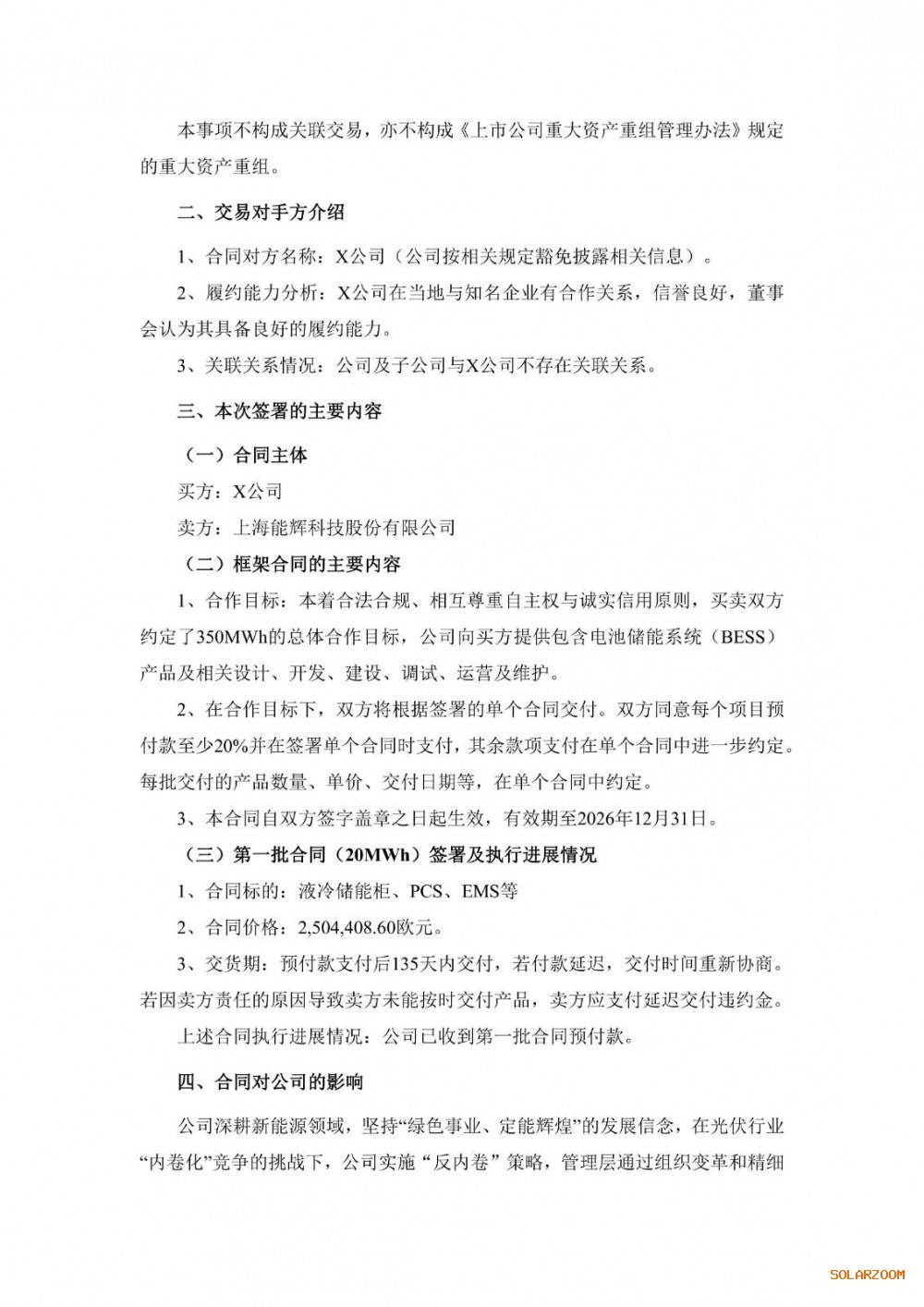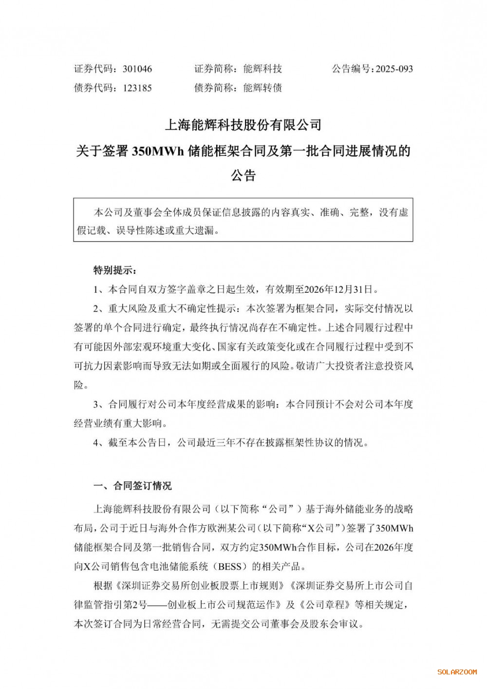 12月8日,能辉科技发布公告称,公司基于海外储能业务的战略布局,公司于近日与海外合作方欧洲某公司签署了350MWh储能框架合同及第一批销售合同,双方约定350MWh合作目标,公司在2026年度向X公司销售包含电池储能系统(BESS)的相关产品。