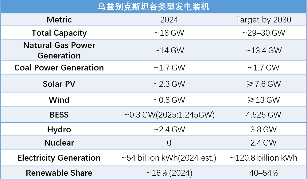 2.能源战略地位:天然气储量居全球第15位,可再生能源开发潜力巨大,预计到2035年,乌兹别克斯坦年用电量达1210亿度。到2030年54%的电力都由新能源发电提供;