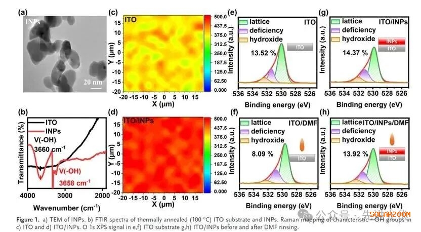 锚定强化:引入富羟基ITO纳米颗粒(INPs)作为中间层,通过稳固的化学键合有效“锁住”自组装分子(SAM)空穴传输层,从根本上抑制其在溶剂处理与长期运行中的脱附问题。