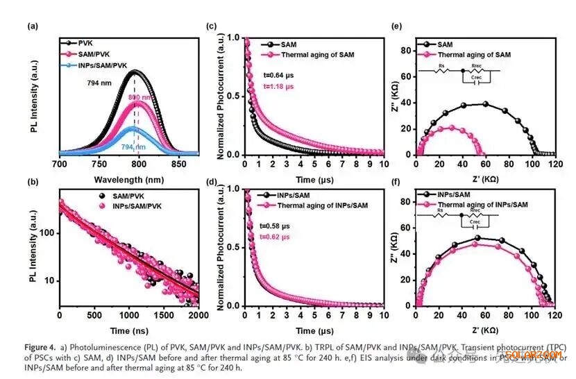 光致发光(PL)和时间分辨光致发光(TRPL)用于研究SAM层与钙钛矿薄膜之间的载流子传输。如图4a所示,ITO/INPs/SAM基底上的钙钛矿显示出比ITO/SAM基底上的更强的PL猝灭,表明孔导电性更高,这归因于在钙钛矿涂覆过程中抑制了SAM的脱附。TRPL数据通过双指数函数拟合(具体细节见表S1.支持信息),其中第一个寿命(τ1)与界面载流子传输相关,第二个寿命(τ2)与体内复合相关。如图4b所示,ITO/INPs/SAM基底上的钙钛矿的τ1(96.50 ns)明显短于ITO/SAM基底上的τ1(187.56 ns),表明孔导电性从钙钛矿到ITO/INPs/SAM的转移速度更快。瞬态光电流(TPC)和电化学阻抗谱(EIS)用于研究PSCs在器件老化过程中的载流子传输行为。如图4c,d所示,随着器件老化,ITO/SAM基底的PSCs的TPC寿命从0.64 µs增加到1.18 µs(表S2.支持信息),表明界面载流子传输退化,这应该是由SAM脱附引起的(表S2.支持信息)。而在ITO/INPs/SAM的PSCs中,TPC寿命仅从0.58 µs略微变化到0.62 µs,表明界面载流子传输稳定。瞬态光电压(TPV,图S8.支持信息)显示对照PSCs在热老化后寿命从1.87 µs降至1.20 µs,而在ITO/INPs/SAM的PSCs中几乎没有变化(3.13 vs 3.07 µs),进一步证明了设备退化的抑制。此外,EIS结果(图4e,f)表明,ITO/INPs/SAM的PSCs具有优越的电学性能,表现为更高的复合电阻(Rrec)和更低的串联电阻(Rs)。在器件老化后,Rrec(从115 kΩ降至109 kΩ)和Rs(从0.15 kΩ增至0.18 kΩ)仅略有变化。而在ITO/SAM对照PSCs中,Rrec在老化后从103 kΩ降至54 kΩ,表明SAM脱附引起的界面传输严重退化。此外,ITO/SAM对照PSCs中的Rs也从0.26 kΩ大幅变化到0.43 kΩ,进一步确认了设备在老化过程中严重退化。