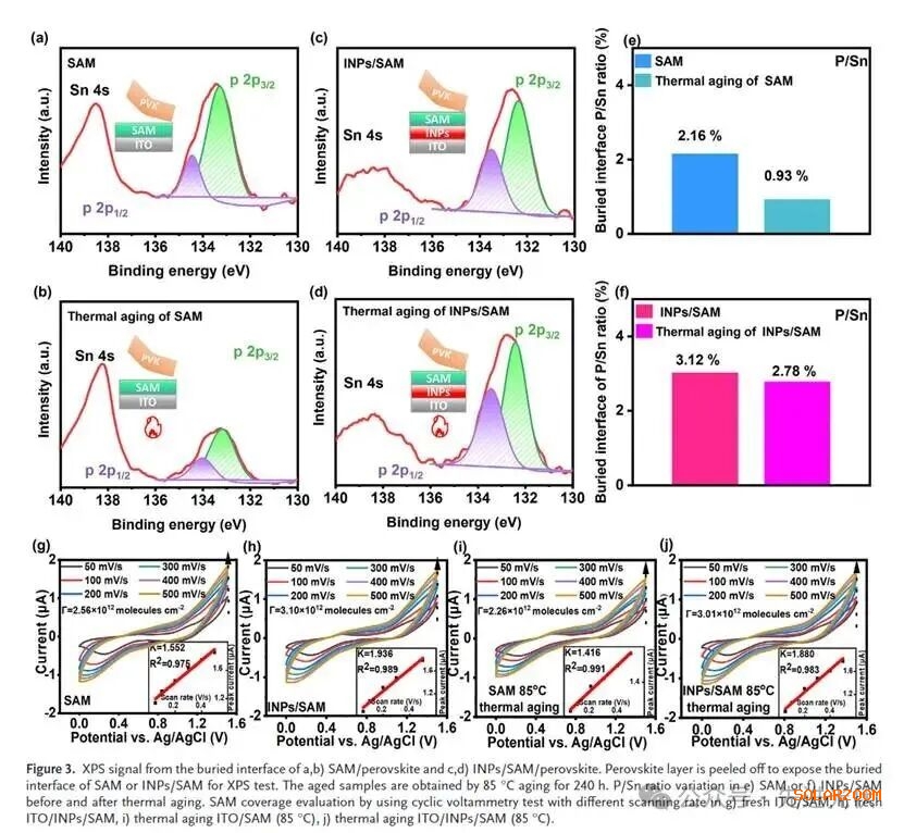 除了DMF清洗外,研究还进一步探讨了SAM在老化过程中的脱附情况。如图3a–d所示,通过剥离新鲜或老化的PSCs中的钙钛矿薄膜,暴露出ITO/SAM基底进行XPS测试。在新鲜的PSCs中,ITO/SAM基底的Sn 4s XPS信号比ITO/INPs基底强,表明SAM在钙钛矿涂覆过程中发生了脱附(DMF/DMSO混合溶剂)。经过85 °C老化240小时后,ITO/SAM基底的Sn 4s信号变强,表明在PSCs老化过程中SAM发生了严重脱附;而在ITO/INPs/SAM的PSCs中,经过老化后Sn 4s信号几乎没有明显变化,表明SAM与INPs之间的强结合力有效抑制了脱附。通过计算P/Sn元素比,进一步评估了PSCs老化过程中SAM的脱附情况。如图3e,f所示,热老化后,ITO/SAM的P/Sn比从2.16%降至0.93%,显示出对照PSCs中SAM的严重脱附;相比之下,ITO/INPs/SAM的P/Sn比仅从3.12%降至2.78%,证明了在器件老化过程中SAM脱附得到了有效抑制。此外,采用循环伏安法(CV)评估了SAM在ITO上的覆盖度(图3g–j)。结果表明,ITO/INPs上的SAM覆盖度(3.10 × 10¹²分子·cm⁻²)比ITO基底上的SAM覆盖度(2.56 × 10¹²分子·cm⁻²)大约高20%,进一步证明了INPs丰富的─OH基团能够促进SAM在ITO基底上的自组装。热老化后,ITO基底上SAM的覆盖度从2.56 × 10¹²分子·cm⁻²减少约12%,而在ITO/INPs上,SAM覆盖度变化较小(约3%),进一步验证了SAM与INPs之间的强结合。