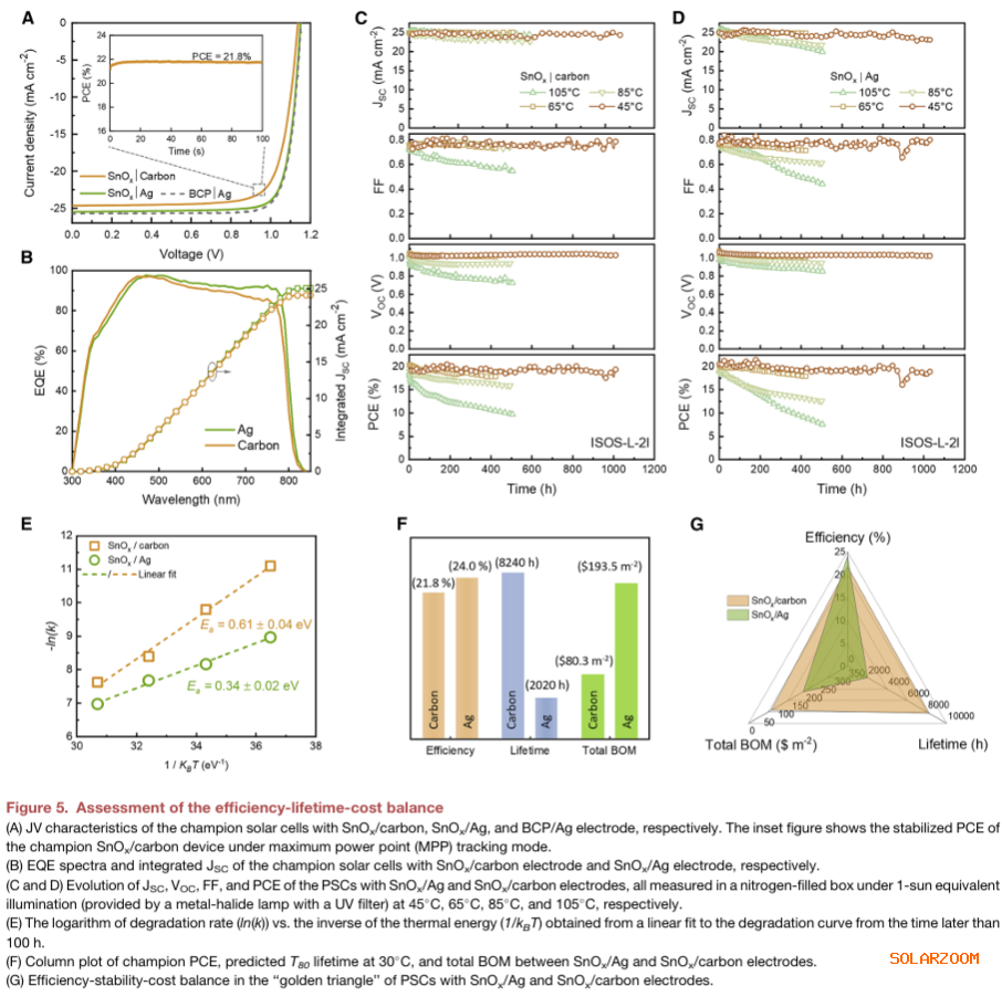 本研究德国埃尔朗根-纽伦堡大学Tian Du和Christoph J. Brabec等人通过引入具有良好机械耐久性和n型掺杂水平的氧化锡(SnOₓ)中间层,成功将碳从空穴收集阳极转变为电子收集阴极,显著降低了电子提取势垒,使碳电极效率(21.8%)与银电极(24.0%)之间的差距大幅缩小。这一进展显著提升了PSCs的实用性:效率的轻微下降被预期使用寿命的3倍提升(>8.000小时)和材料成本降低60%所抵消,凸显了碳作为低成本替代材料在p-i-n型PSCs产业化中的潜力。
