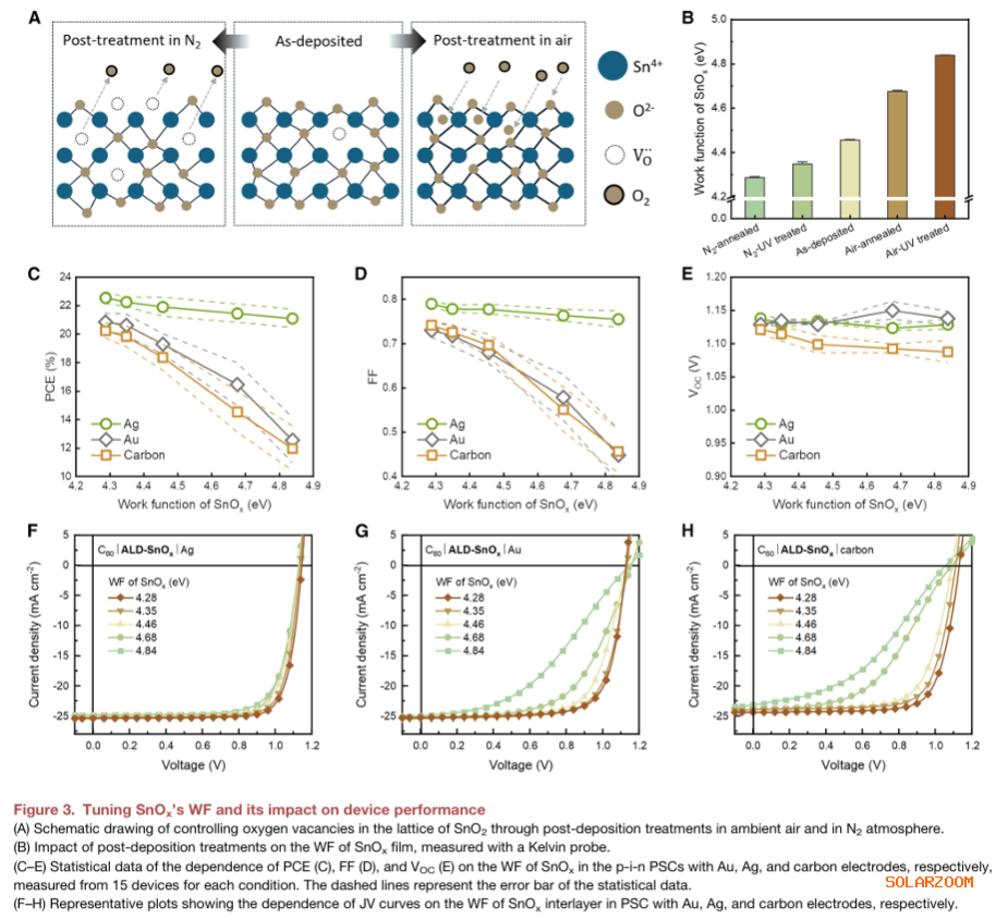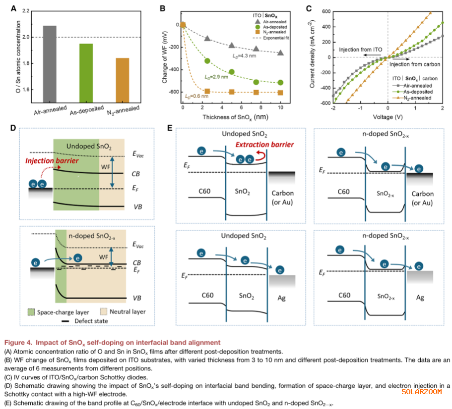提出普适性界面设计原则:通过调控SnOₓ中的氧空位浓度,实现能带对齐与电子隧穿,为n型金属氧化物与碳之间的高效电子提取提供了通用物理机制。